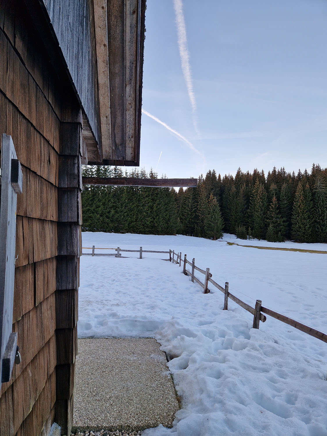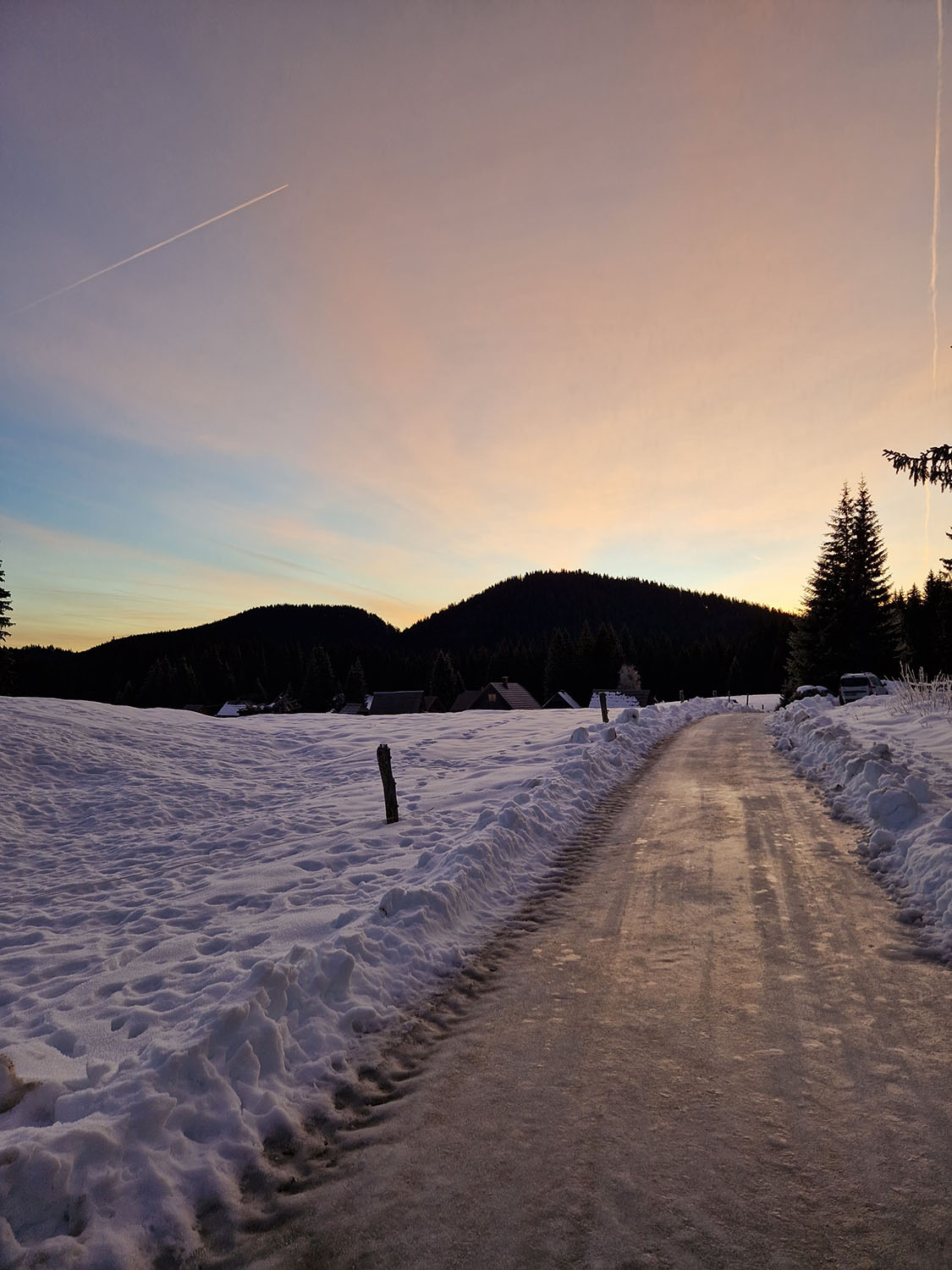 But you know that feeling when unexpected happiness replaces disappointment? Well, that feeling overwhelmed us like an avalanche – when, 3 minutes from the end of our path, we saw a pile of snow that welcomed us calmly and carefree! Just like our accommodation in Pokljuka. The first requirement for looking for accommodation was a warm winter house or cabin where the atmosphere is really snowy, so we could completely blend in with nature and the atmosphere – and, no less important, that we can take all the food we have left at home from the holidays.