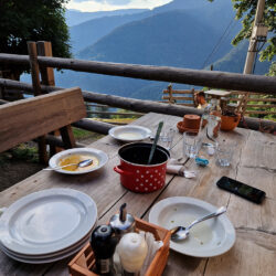 Iako smo se dobro obukli i pripremili, nismo očekivali da je vrijeme na planini baš toliko varljivo. U par sati se promijenilo isto toliko puta (dobro, ipak nije pao snijeg ☺). Zato, savjet svima, pogotovo ljeti: u ruksaku ponijeti duge rukave. Jakne, kape, šuškavce – da, da, usred ljeta! Bilo mi je tužno gledati brojne klince i roditelje kako se oko nas smrzavaju u ljetnoj obleki – bar u ona doba kad je bilo hladnije, mada je bilo i perioda kad smo bili u kratkim rukavima. No, za planinu uvijek treba biti obučen slojevito. Šteta bi bila da vam provod propadne jer se gore kuhate ili pak smrzavate! U neko doba je pala i kiša, što je na planini zbilja ekstra doživljaj. Sve šumi, miriši, prekrasno izgleda: naravno, nije zgorega kad guštate pod kišobranom!