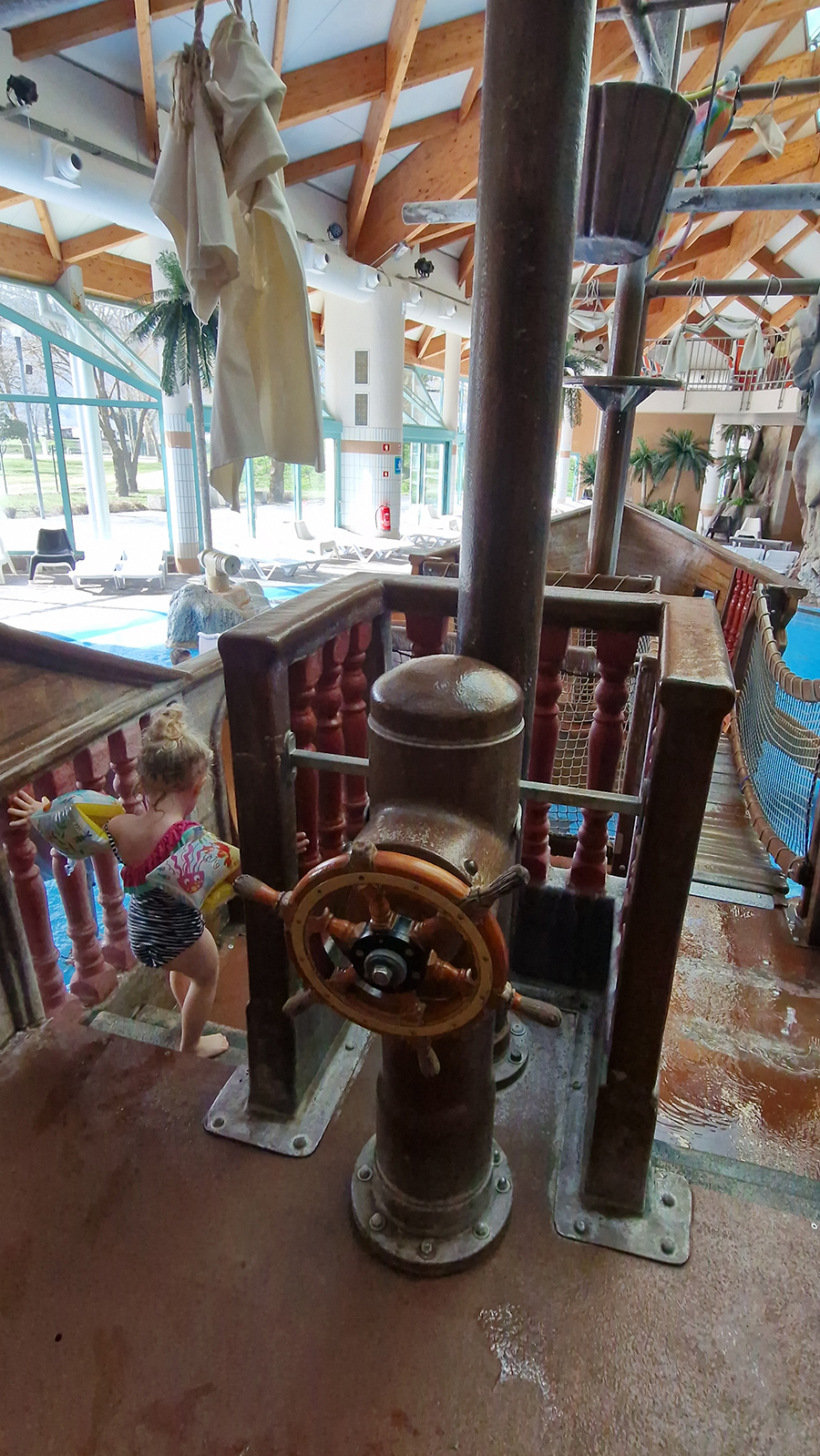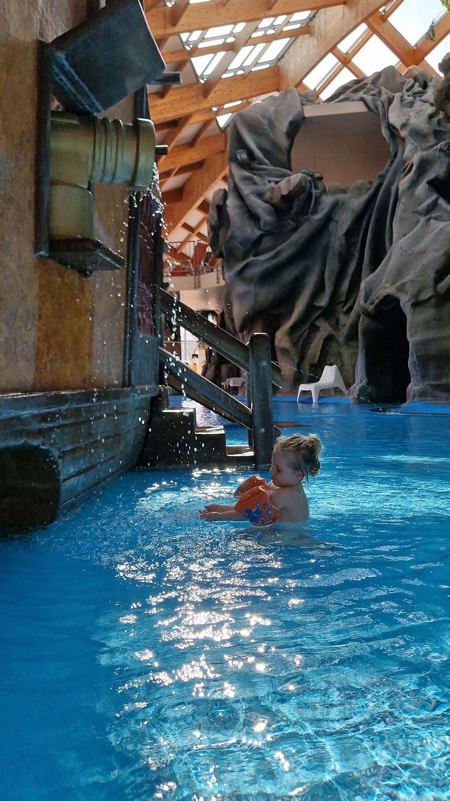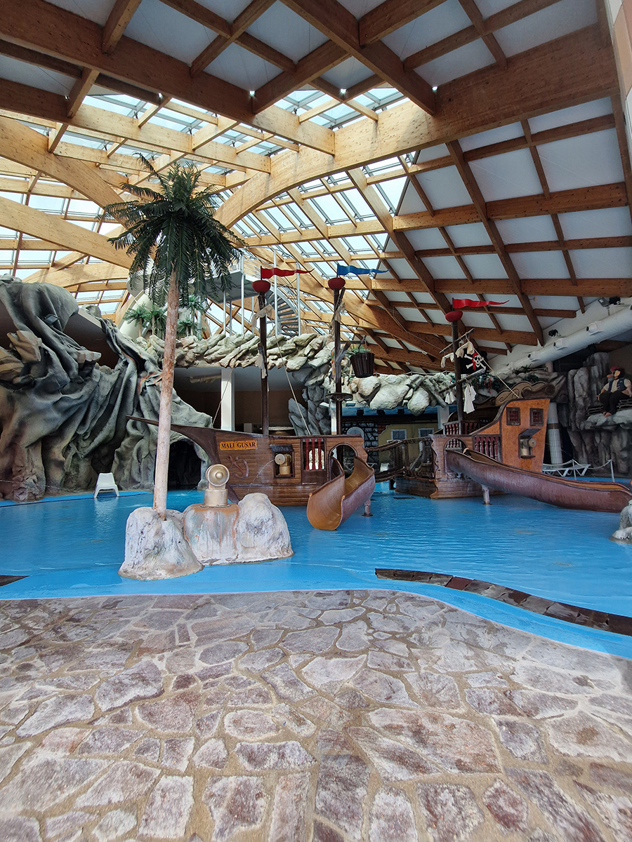 Nisam imala pojma koliko je velik unutarnji dio s bazenima. Priznajem, očekivala sam da je manji, pa sam ostala paf i prije nego sam ušla u bazen! Osim što je ogroman, bazen je vrlo pametno strateški izgrađen. U velikom bazenu (onome za odrasle) su penzići vježbali aguaaerobic, i to uz glazbu Enriquea Iglesiasa (i svima nam pružili dobar primjer za povratak vježbanju). Na drugom krilu su bazeni za djecu (veću i manju). Naravno, bazeni nisu „sami“! Tu su tobogani za veću i malo veću djecu te prefora gusarski brod za najmanje klince.
